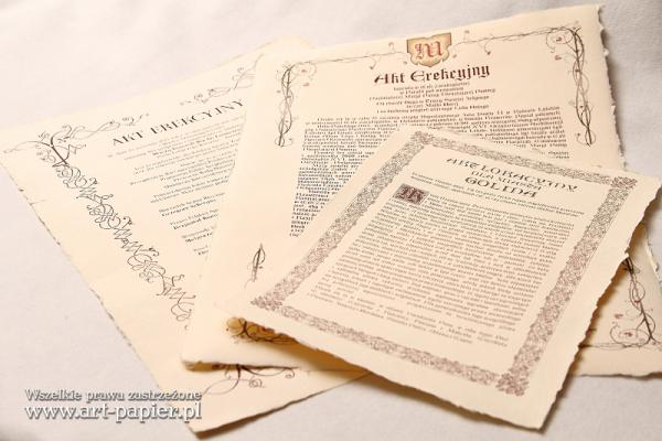 Dyplomy na papierze ręcznie czerpanym są nie tylko ważnym, oficjalnym dokumentem, ale stanowią też piękną pamiątkę. Wykonujemy dyplomy dla absolwentów szkół wyższych w wersji ozdobnej, jako dodatkowy dokument, który eksponują w swoich gabinetach, kancelariach i biurach. Drukujemy także akademickie dyplomy zgodne z wytycznymi określonymi w ustawie. Do dyplomów możemy dobrać ozdobne tuby lub teczki dostosowane wielkością i stylem do dokumentu.Każdy druk możemy także opatrzeć lakową pieczęcią lub suchym tłoczeniem.Prosimy o przesyłanie projektów graficznych wektorowych (krzywe).